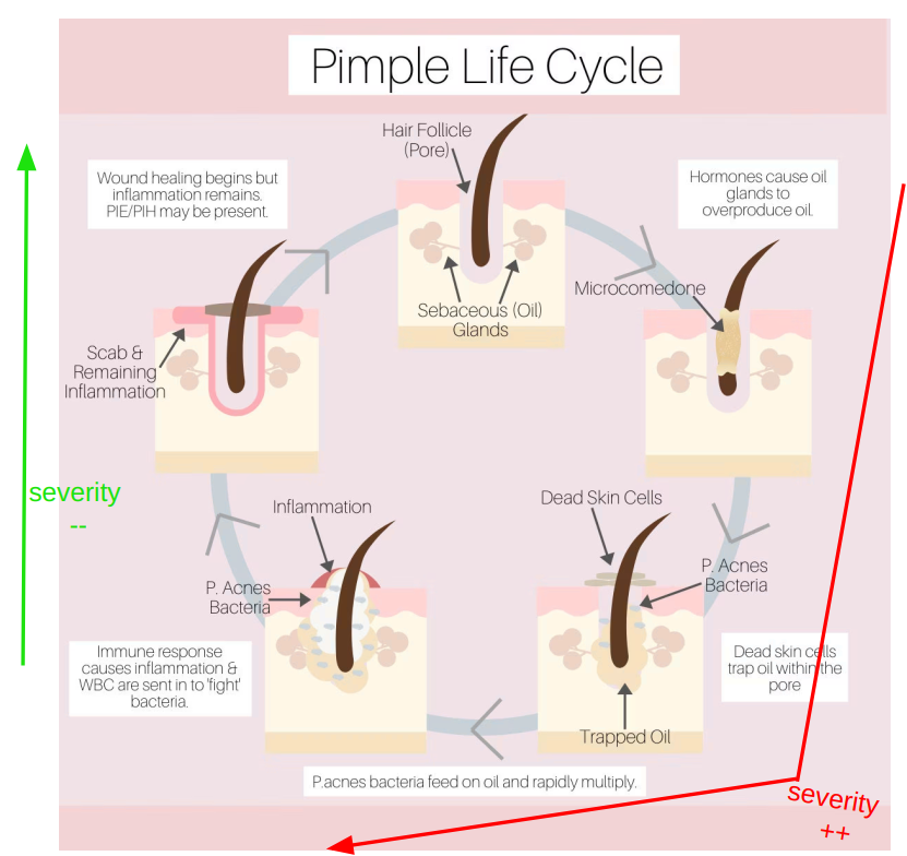 - Visually, it can be hard to know in which stage of the pimple we are, because the severity may be the same, but can be either in the ascent (= getting worse) , or in the descent (= getting better) of the curve.