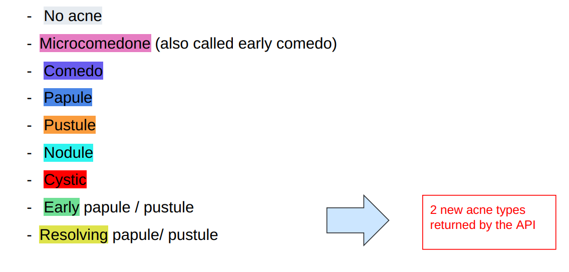 - The API will output all these types, but depending on the usecase, one can choose to group /remove some acne types. It is to the dev team (according to the sales/business team opinions) to define how to show the results