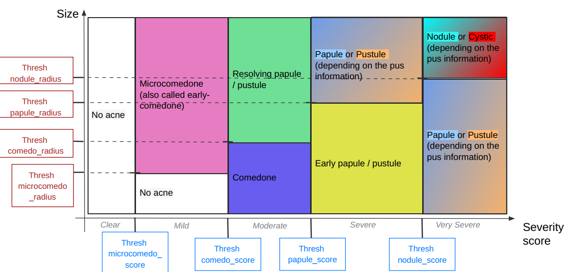 - Based on the prediction of the AI model [severity score, pus info, scar info] and the size of the lesion, we classify each pimple to one of the following types: