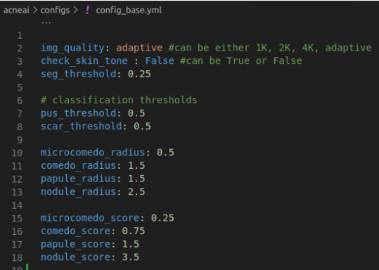 - scar_threshold: should be a float between 0 and 1. if the pus information is below this value, then we consider that the lesion is a scar and belongs to the ‘no acne’ class, otherwise, we classify it in one of the other acne types.