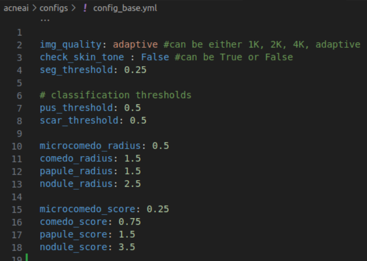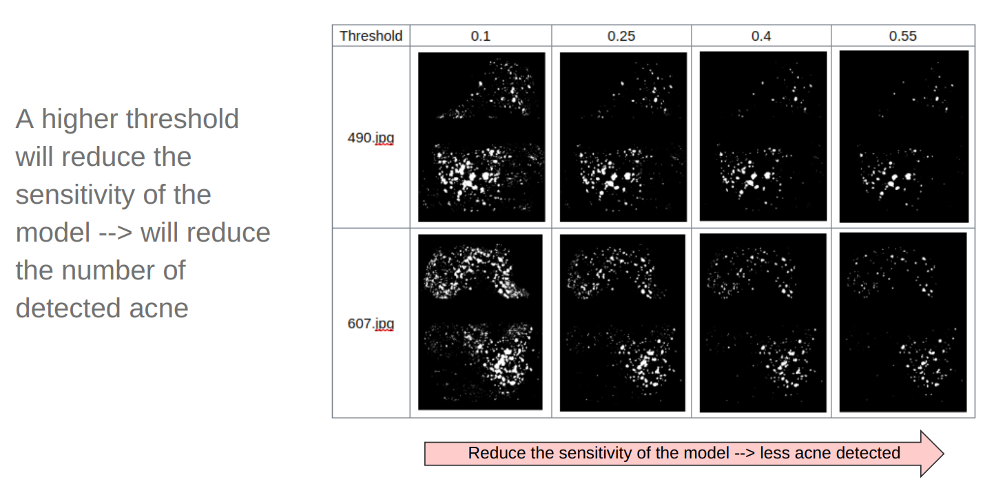 - seg_threshold: should be a float between 0 and 1 (we recommend between 0.25 and 0.5) corresponds to the threshold of the AI output for the acne segmentation model.