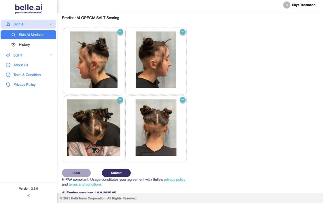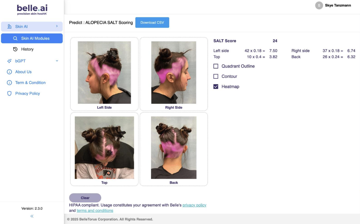 - The heatmaps on each image are the outputs of the AI model. These heatmaps allow the model to localize the different areas with hair loss. The intensity of the heatmaps represent the severity of the hair loss (the whiter the heatmap, the more hair loss).