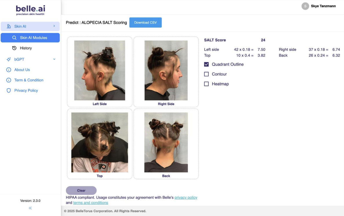 - The model provides an overall standard SALT score, ranging from 0 (no hair loss) to 100 (complete hair loss). This SALT score is the sum of hair loss from each of the four standardized quadrants.