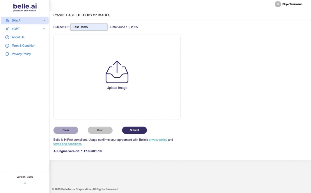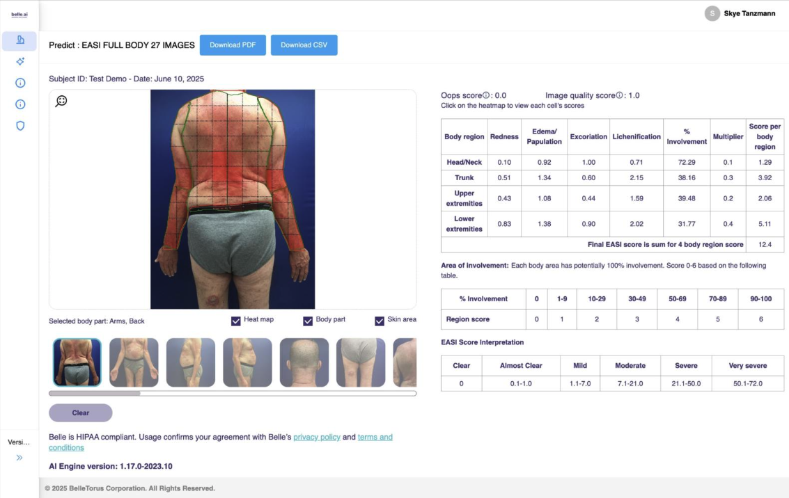 - Then, the AI will analyze the image, providing an overall EASI score sum across four body regions (with a range of 0 to 72).