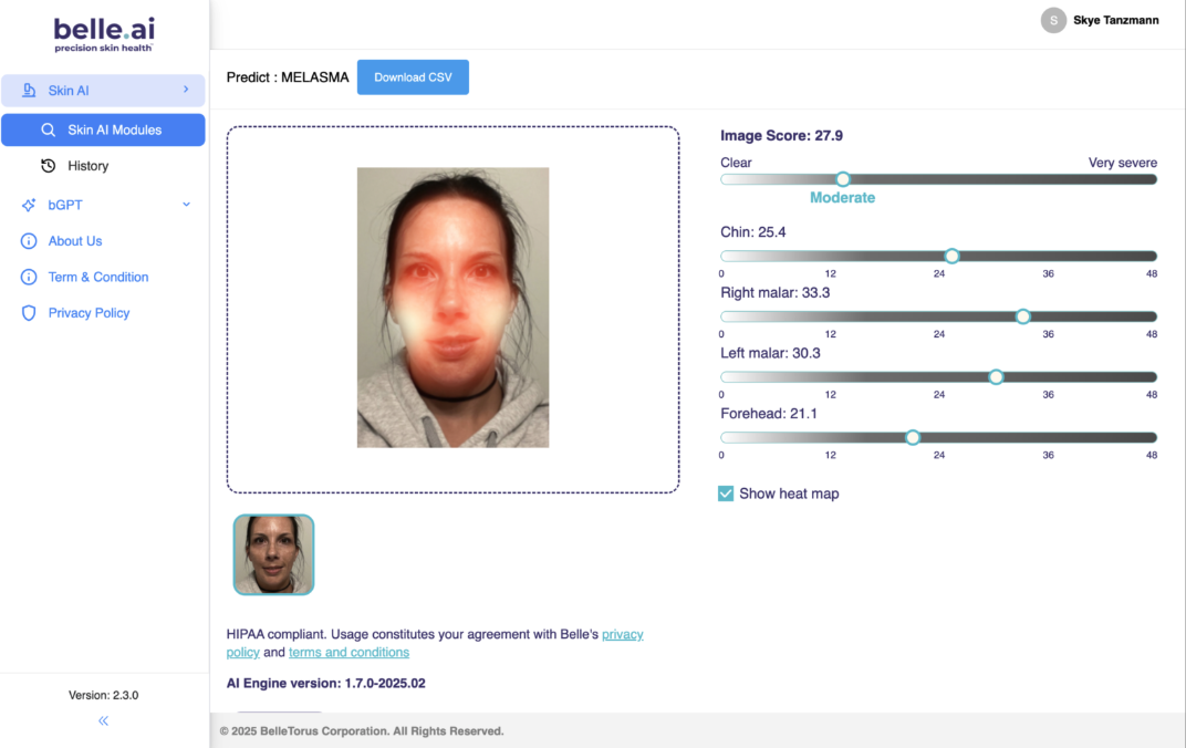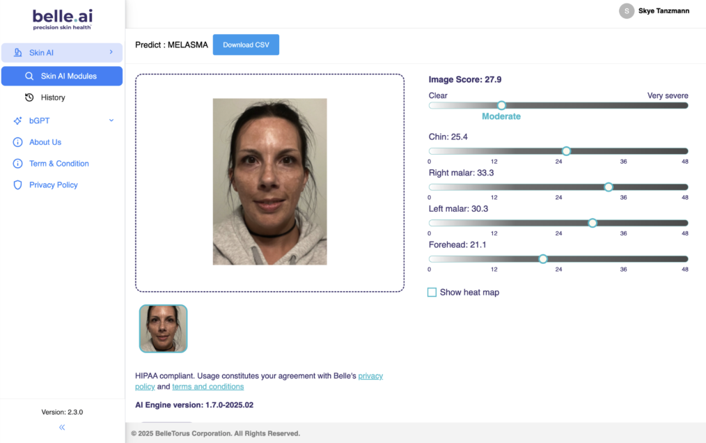 - The AI will then analyze the image. The model provides a Melasma Area and Severity Index (MASI) score from clear (0) to very severe (48) for the overall image, and for four segments (chin, right malar, left malar, and forehead) based on AI-predicted heatmaps. This score depends on the degree of pigmentation, and the affected area.