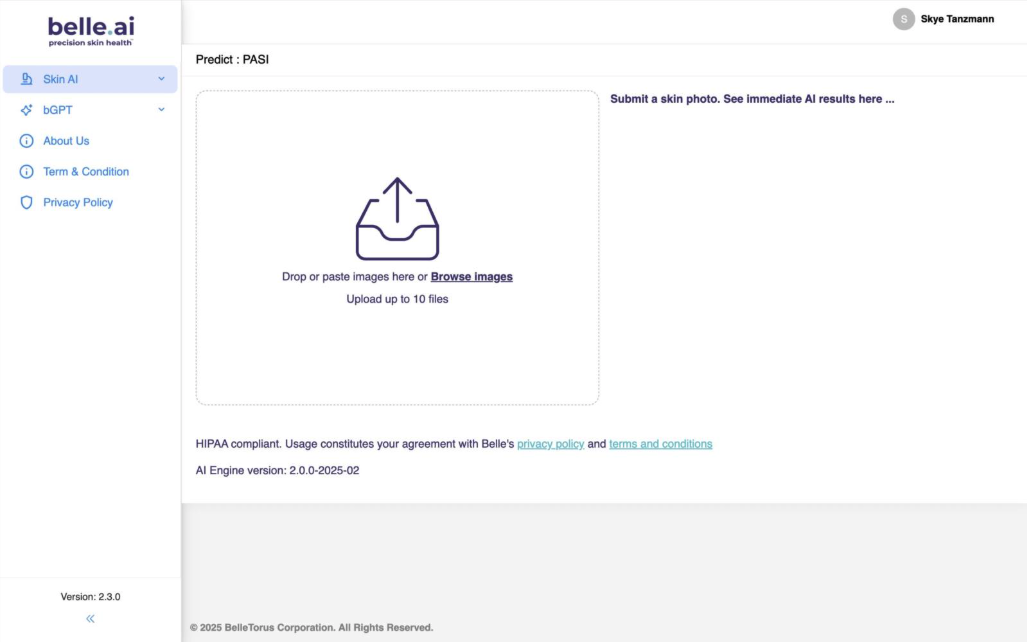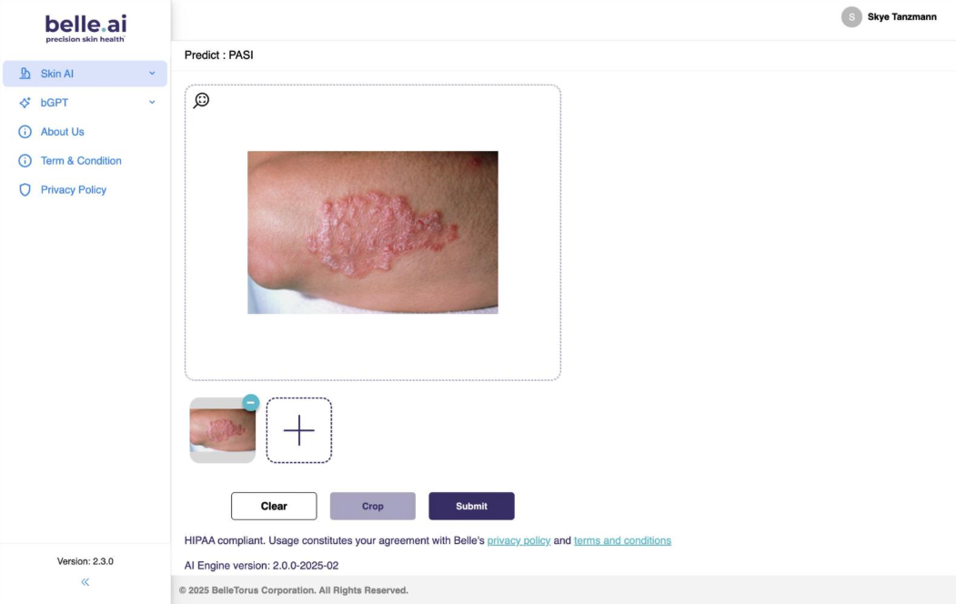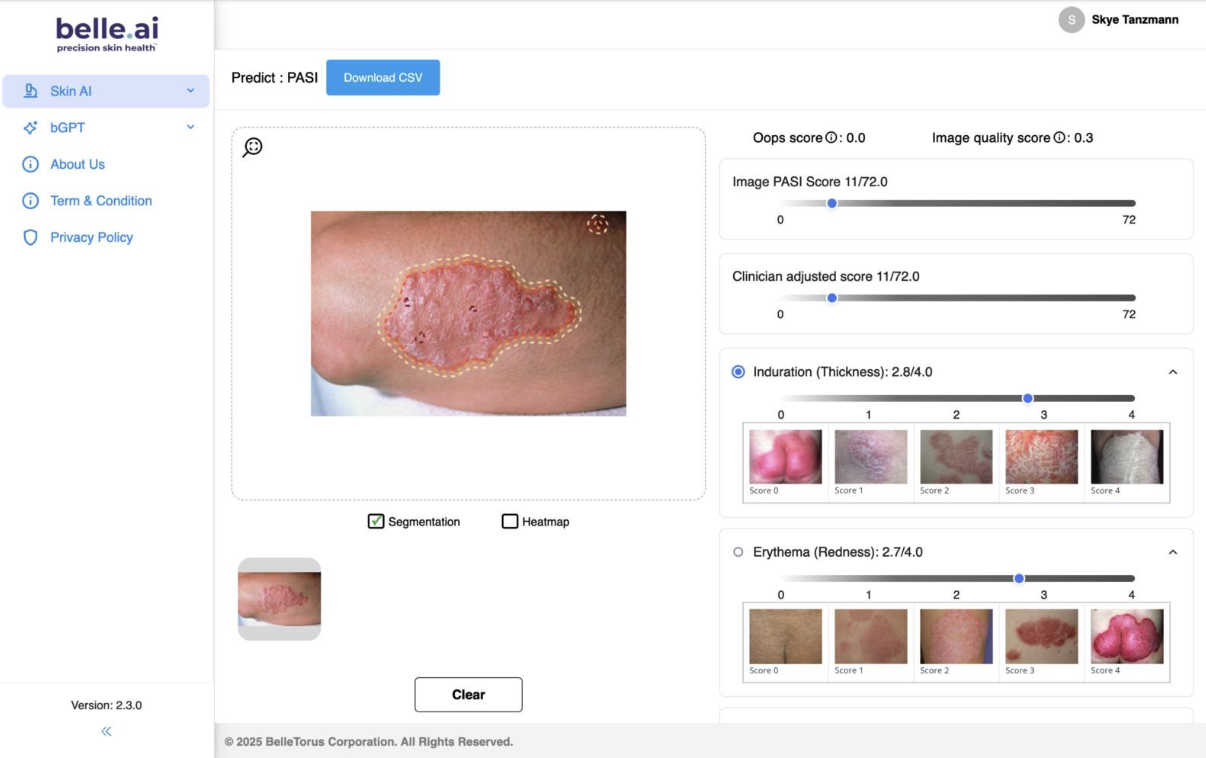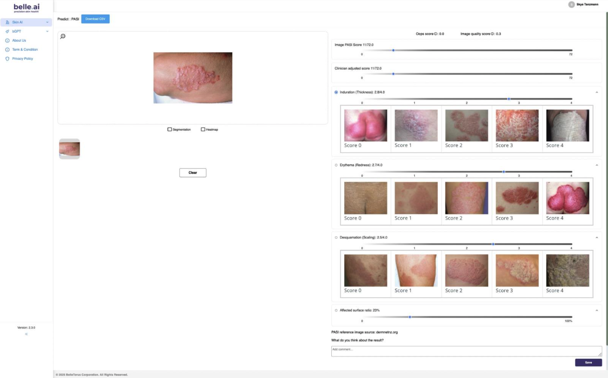 The model will produce an AI-predicted PASI score and clinicians may move the slider bars to create a Clinician Adjusted Score.
